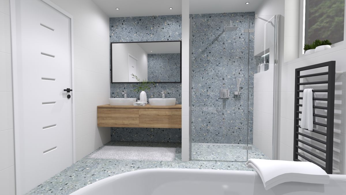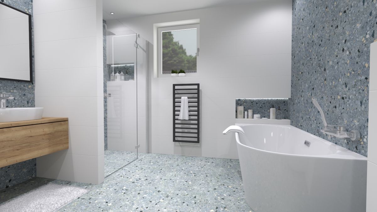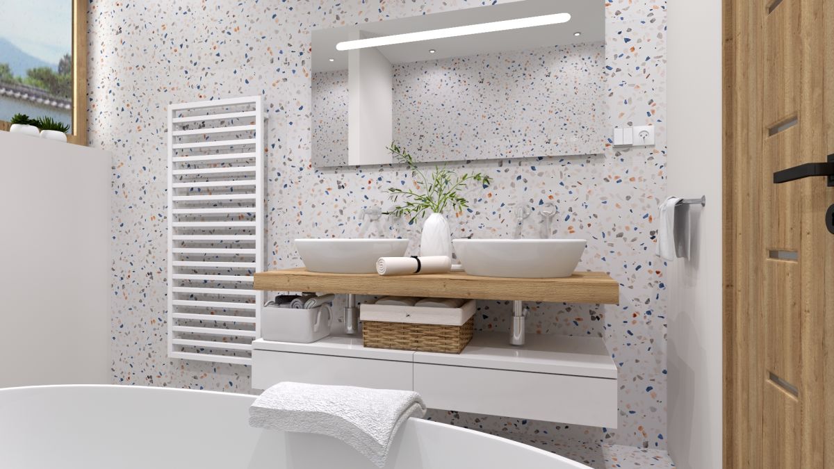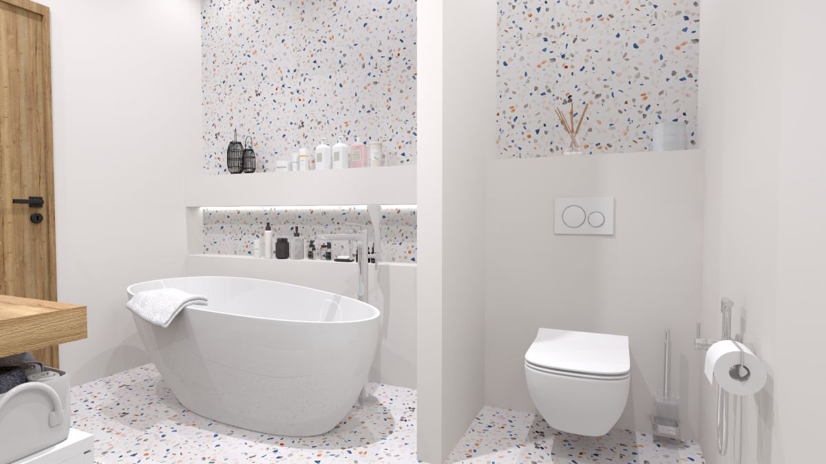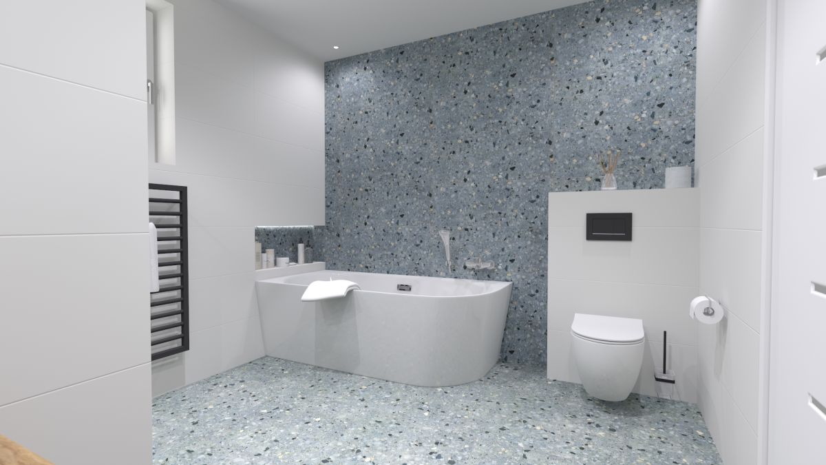 Vzor v bielej, ružovej a bledomodrej farbe nepúta len zrak, ale zároveň vytvára aj útulnú atmosféru. Terrazzo je jednoducho životný postoj.